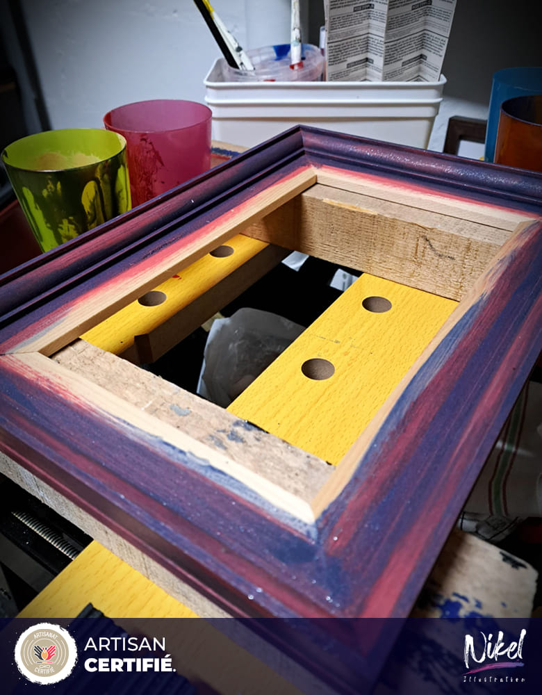 Je conçois et fabrique chacun de mes cadres entièrement à la main, à partir de planches et de moulures de 2,40 m que je découpe, assemble, colle et renforce. Chaque cadre est pensé comme une extension de l’œuvre qu’il accompagnera. Les finitions sont personnalisées : choix des teintes, textures, éclaboussures, feuilles d’or, patines, paillettes… Je travaille aussi avec des peintures récupérées auprès de particuliers, dans une démarche zéro gaspillage. Je ne prends jamais la couleur directement du pot : chaque mélange est créé manuellement, ce qui rend chaque cadre unique jusque dans sa matière. « Un cadre n’est pas qu’un support : il fait partie intégrante de l’œuvre, lui donnant son identité finale. »