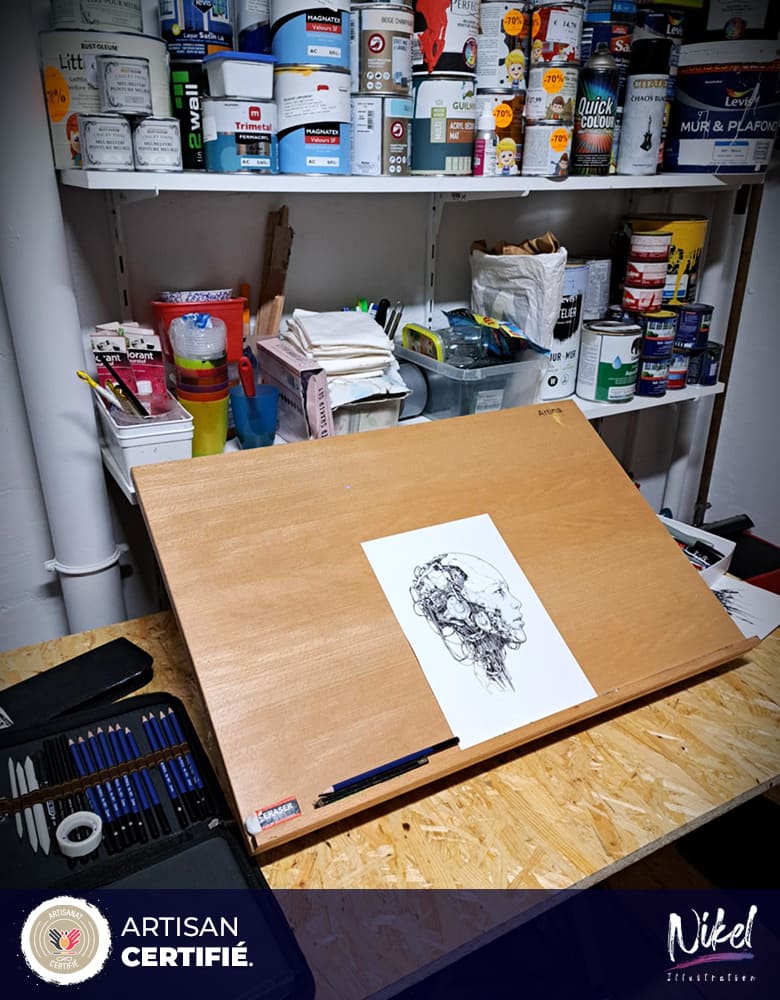 Chaque création est signée, parfois vernie, et souvent proposée en tirage limité. Du premier croquis jusqu’à la fabrication du cadre, l’ensemble du processus est réalisé dans mon atelier, garantissant une approche artisanale, personnelle et sincère. Mon travail repose sur l’émotion, la spontanéité et l’envie de raconter quelque chose. Chaque pièce signée Nikel Illustration est le résultat d’un savoir-faire manuel mêlé à une expression artistique contemporaine, une œuvre qui vit par la matière, le geste et l’intention. Découvrez mes collections et laissez-vous inspirer par des créations uniques, réalisées entièrement à la main et pensées pour éveiller vos émotions.